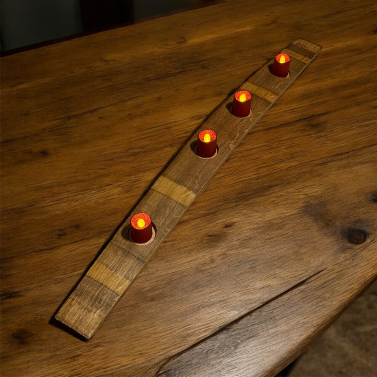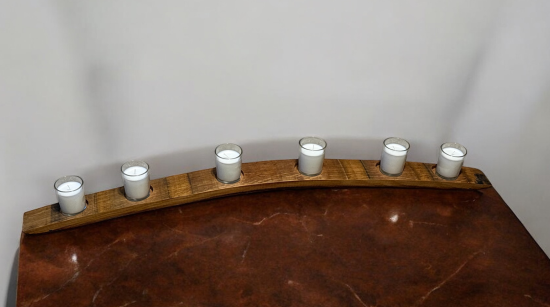 This candle holder is crafted from an authentic oak red wine barrel stave, thoughtfully repurposed to preserve the character and history of the wine it once held. Gently curved and rich with natural grain, the oak bears subtle wine stains and deep, warm tones that tell a story of aging and craftsmanship. Each stave is carefully cleaned and shaped to hold a candle securely, allowing the soft glow of the flame to highlight the wood’s texture and natural imperfections. The result is a rustic yet elegant piece that blends Old World charm with sustainable design, bringing warmth, character, and a hint of vineyard romance into any space.